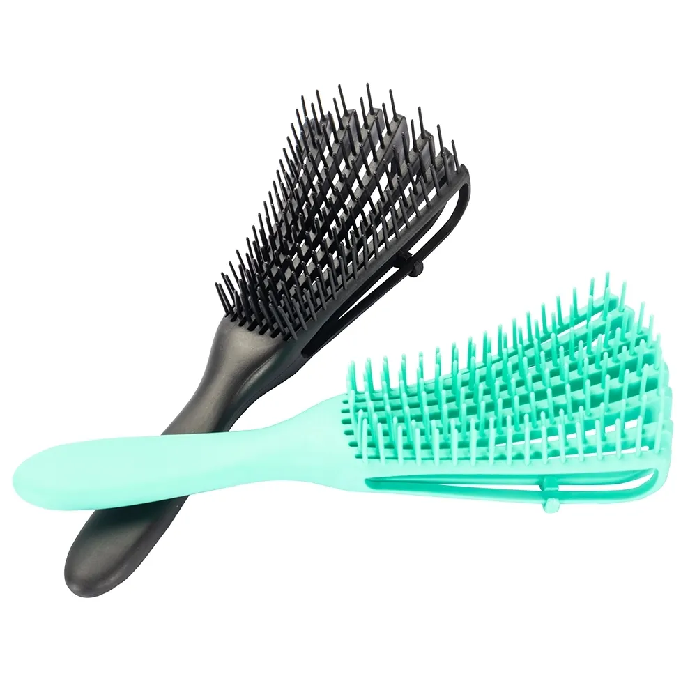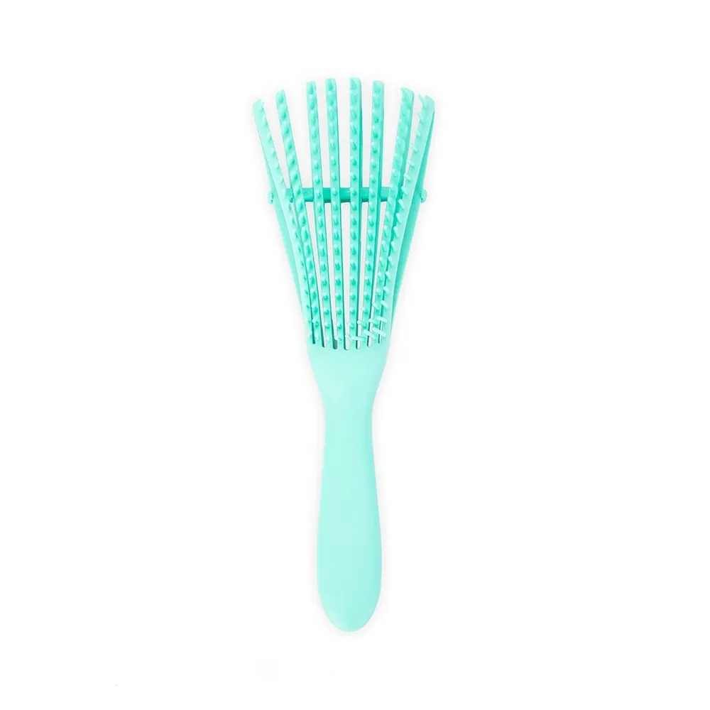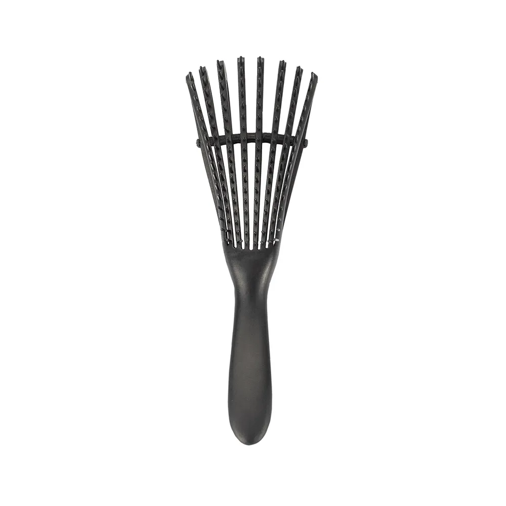 Escova em plástico com formato ergonômico e cerdas flexíveis posicionadas em alturas diferentes, que desembaraçam os fios sem puxar ou quebrar e ainda massageiam o couro cabeludo.