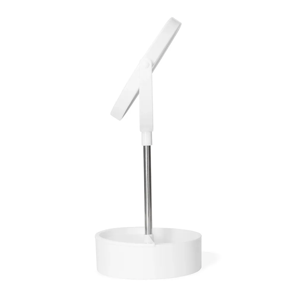 Espelho de mesa dupla face giratório com base e moldura feitas em plástico e pedestal de alumínio. Contém três divisórias na base para organizar de objetos diversos.