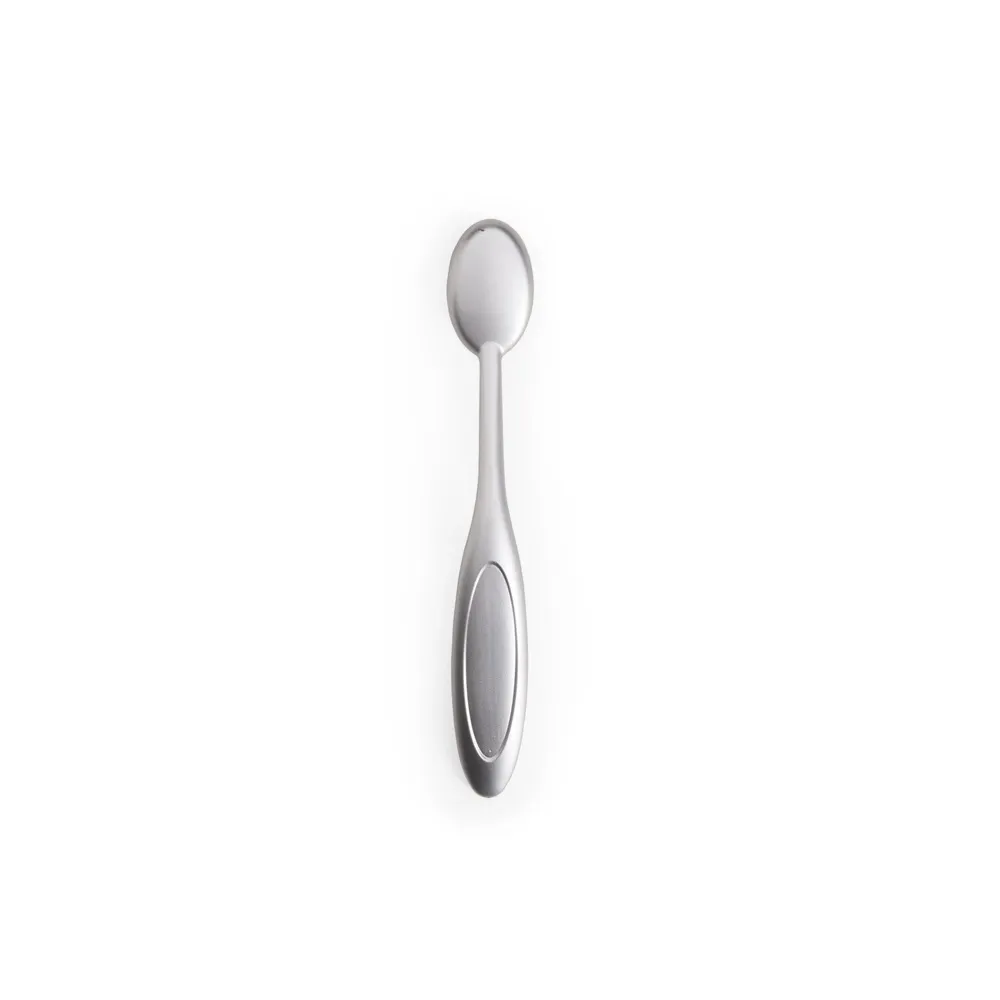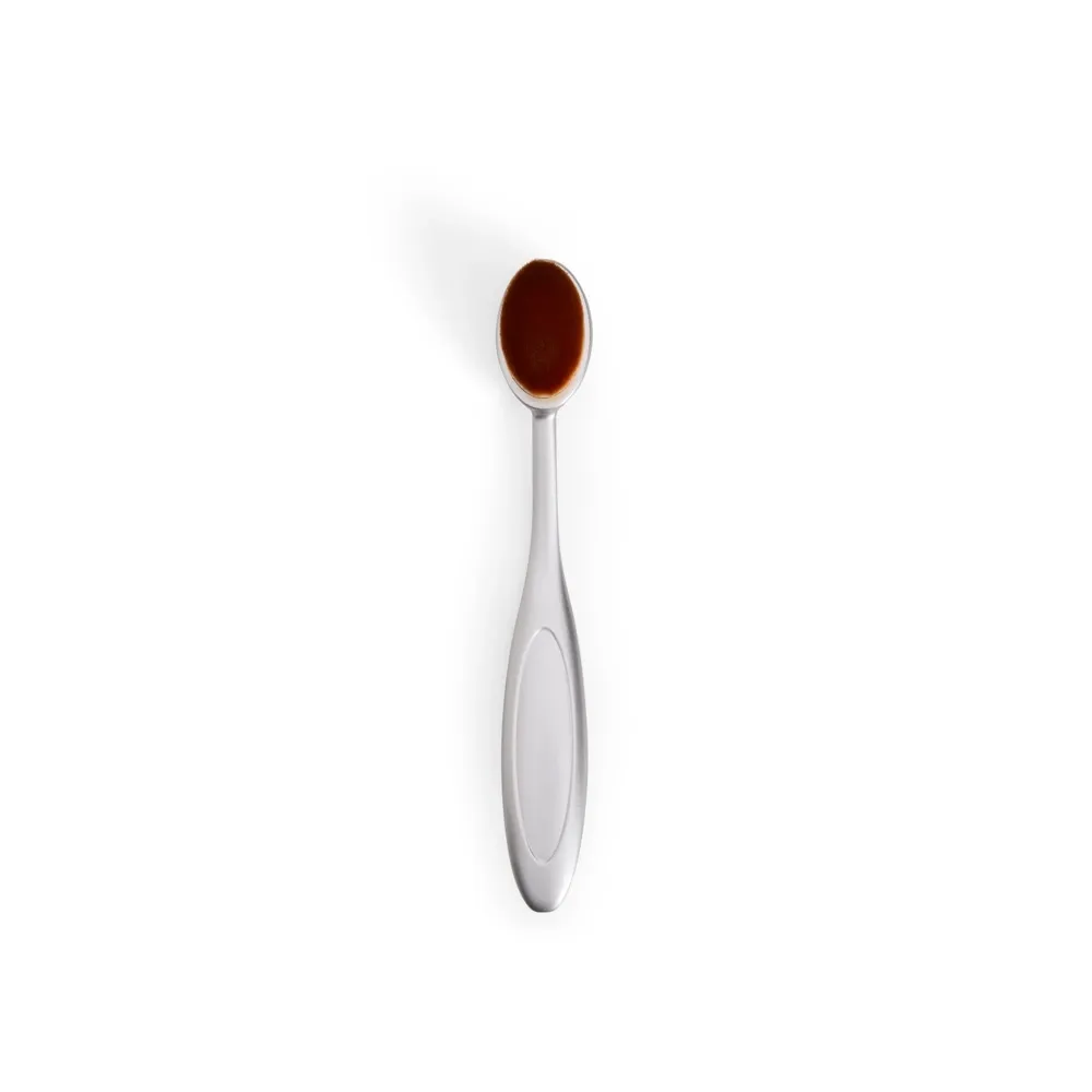 Pincel de maquiagem com design do tipo escova em plástico. Possui cerdas macias dispostas em formato oval, ideal para a aplicação suave de bases líquidas ou em creme.