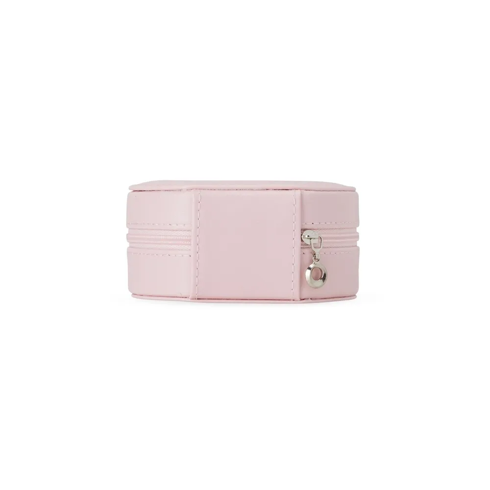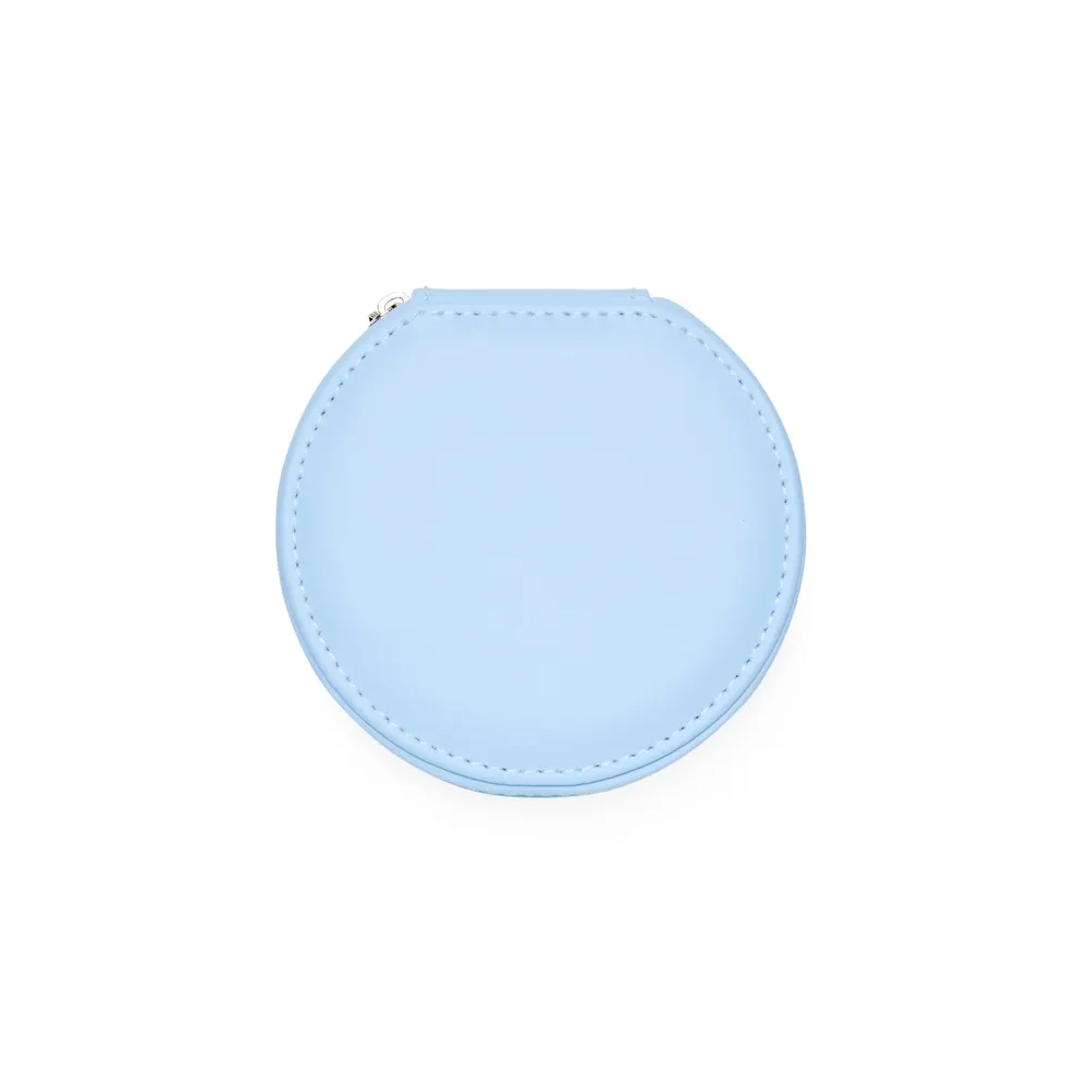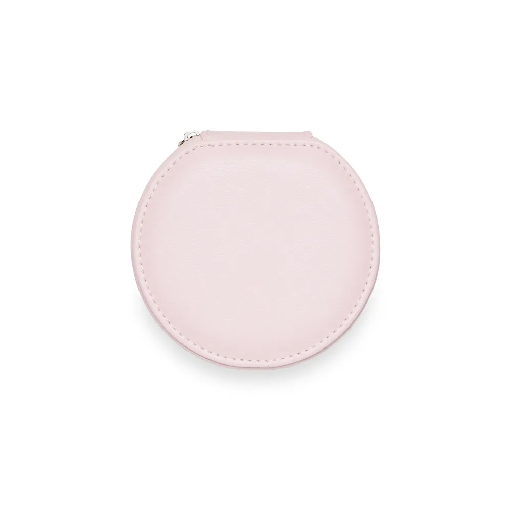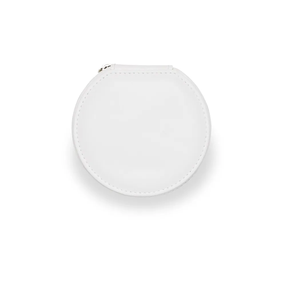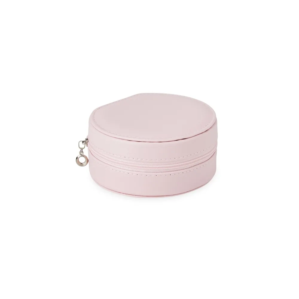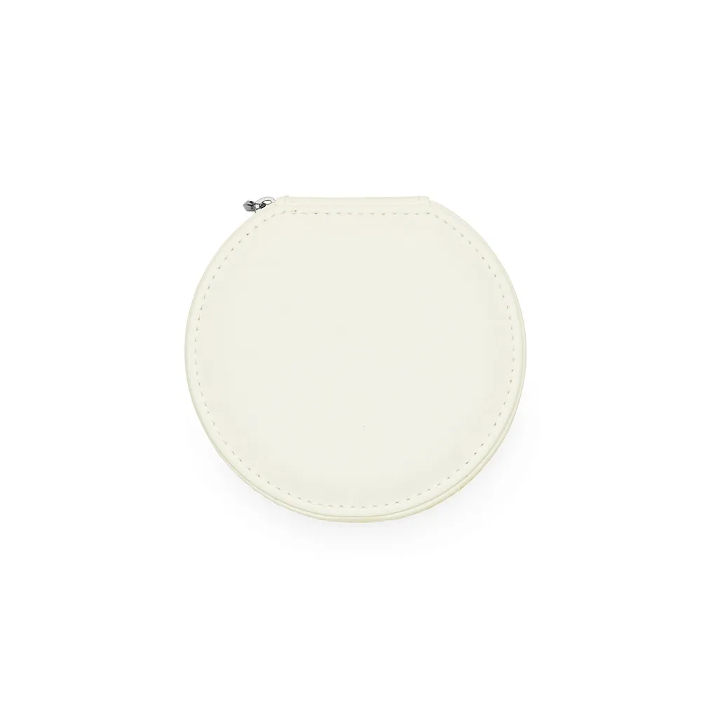 Porta-joias arredondado feito em couro sintético com revestimento aveludado e fechamento em zíper. Possui bolso elástico e três ganchos pequenos na parte interna da tampa, além de divisória multiuso e repartição almofadada com ranhuras para anéis, ambos localizadas no compartimento principal.