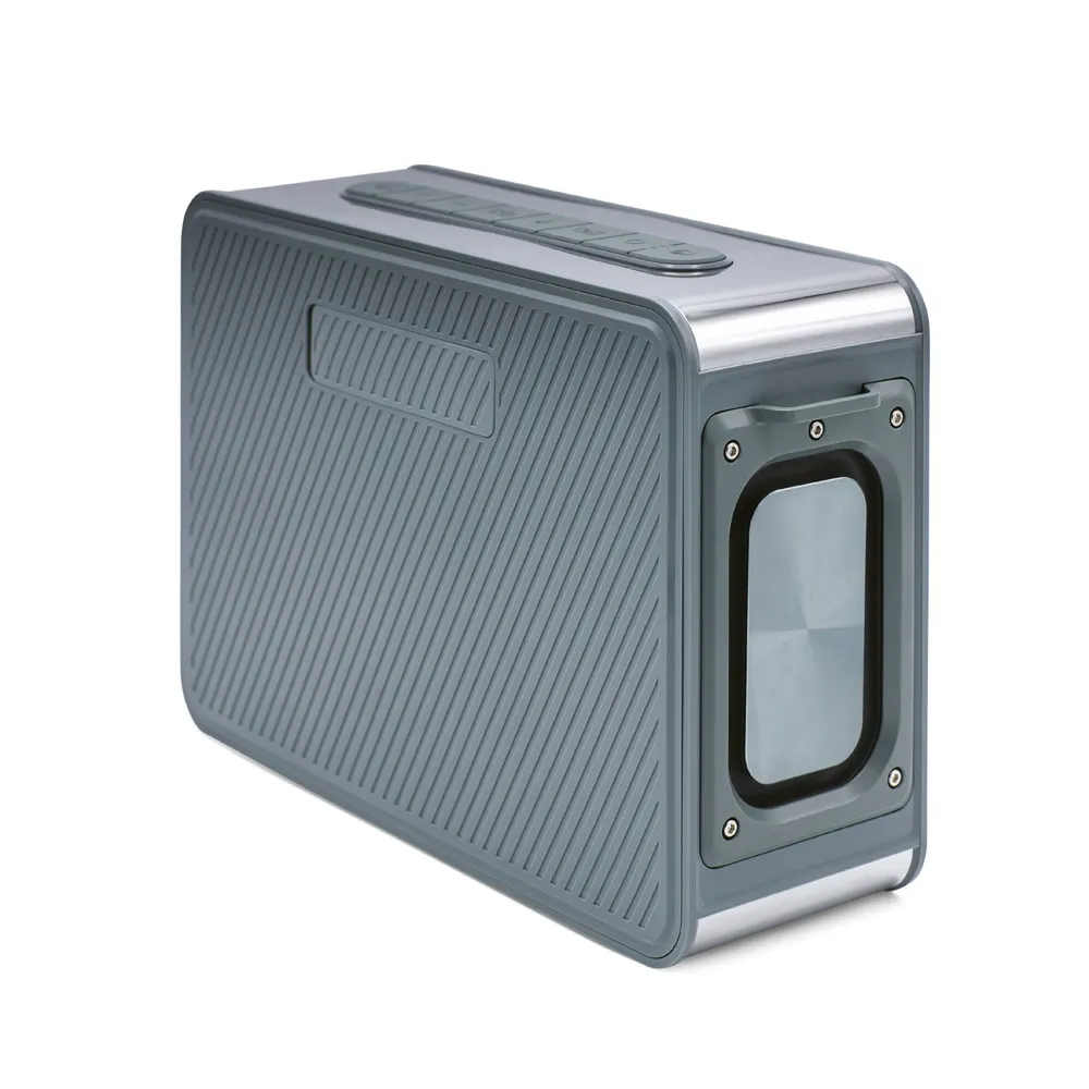 Caixa de som em ABS 100% reciclado com 80W de potência. A capacidade da bateria é de 5200 mAh, o que permite uma autonomia aproximada de 7h. Tem equalizador com 3 modos, transmissão BT 53, entrada e saída AUX e permite ligar microfone externo ou guitarra diretamente. Possibilidade de emparelhar duas caixas de som Jouncer para efeito stereo. Incluso carregador e uma alça para transporte da caixa de som ao ombro. Fornecido em caixa presente de papel kraft. A grelha é fornecida solta para pedidos não personalizados. 293 x 198 x 105 mm | Caixa: 330 x 309 x 147 mm