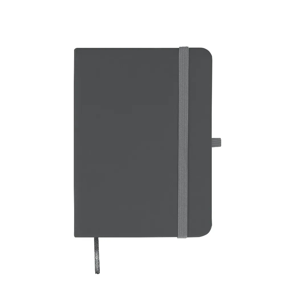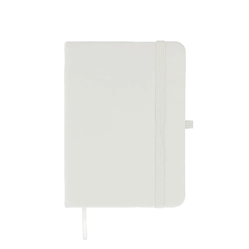 Caderneta emborrachada com elástico para lacre, marcador de página em cetim e porta caneta, contém aproximadamente 84 folhas marfim com pauta.