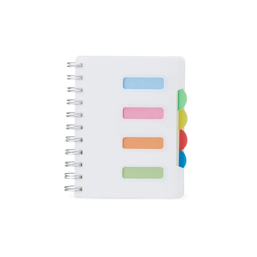 Caderno pequeno com 4 divisórias e abas para identificações, capa plástica com wire-o metálico. Contém aproximadamente 103 folhas marfins e folha inicial com tarjas para organizar e identificar as divisórias.