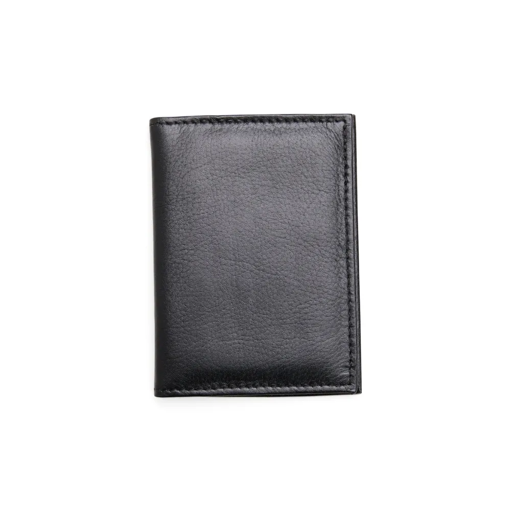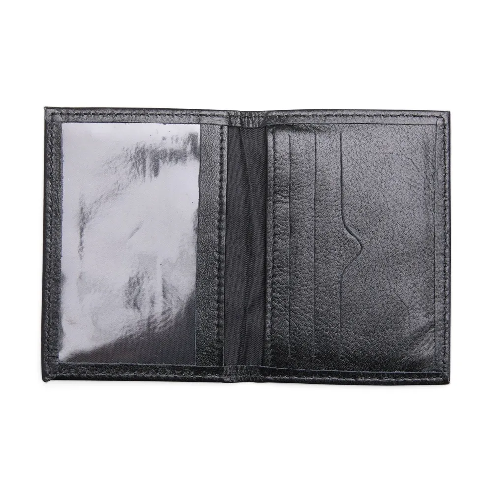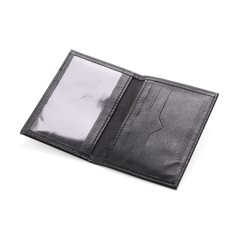 Porta-cartão em couro com três divisórias para cartões e documentos, além de um bolso adicional com visor em plástico transparente.
